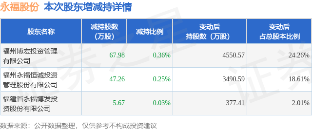证券之星消息,1月21日永福股份发布公告《永福股份:简式权益变动报告书》,其股东福州博宏投资管理有限公司、福州永福恒诚投资管理股份有限公司、福建省永福博发投资股份有限公司于2026年1月20日至2026年1月21日间合计减持120.91万股,占公司目前总股本的0.6447%,变动期间该股股价下跌3.02%,截止1月21日收盘报28.86元。