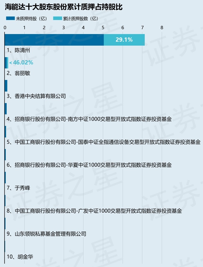 截止本公告日,股东陈清州已累计质押股份2.07亿股,占其持股总数的29.1%,股东翁丽敏已累计质押股份810.0万股,占其持股总数的46.02%。本次质押后海能达十大股东的累计质押股份占持股比例(占持股比例的计算以公司最新一期财务报表公布的十大股东的持股总数为基准)见下图: