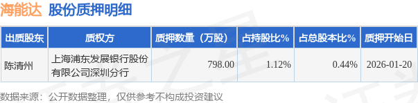 证券之星消息,海能达(002583)1月22日公开信息显示,股东陈清州向上海浦东发展银行股份有限公司深圳分行合计质押798.0万股,占总股本0.44%。质押详情见下表: