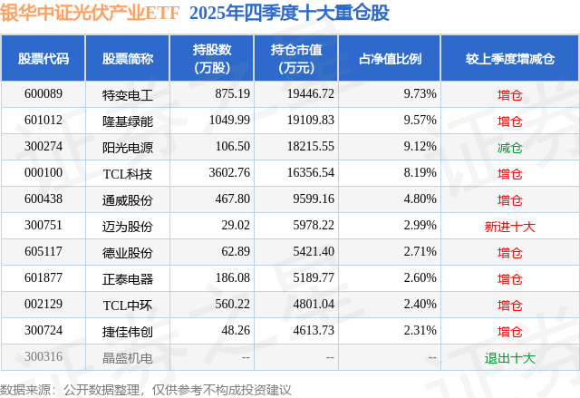 银华中证光伏产业ETF基金成立于2021年1月5日,基金经理为王帅,基金跟踪标的为中证光伏产业指数,成立以来超额回报为5.11%,近一个月超额回报为-0.15%。最新披露的基金持仓数据显示,截止2025年12月31日,该基金第一大重仓股为特变电工(600089),持股占比为9.73%。