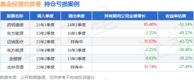 刘彦春管理的景顺长城新兴成长混合A基金在21年1季度买入药明康德,在持有3年又0个季度后在24年1季度卖出。持有期间的估算收益率为-51.14%,持有期间药明康德在2021年到2024年的年报归属净利润增幅达85.4%。