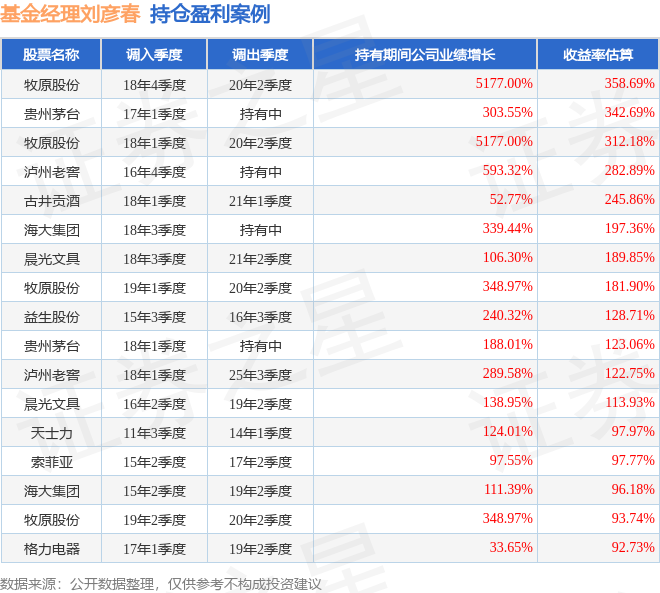 刘彦春管理的景顺长城新兴成长混合A基金在18年4季度买入牧原股份,在持有1年又2个季度后在20年2季度卖出。持有期间的估算收益率为358.69%,持有期间牧原股份在2018年到2020年的年报归属净利润增幅达5177%。