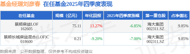 证券之星消息,截止2025年四季度末,基金经理刘彦春旗下共管理2只基金,本季度表现最佳的为景顺鼎益LOF(162605),季度净值跌6.85%。