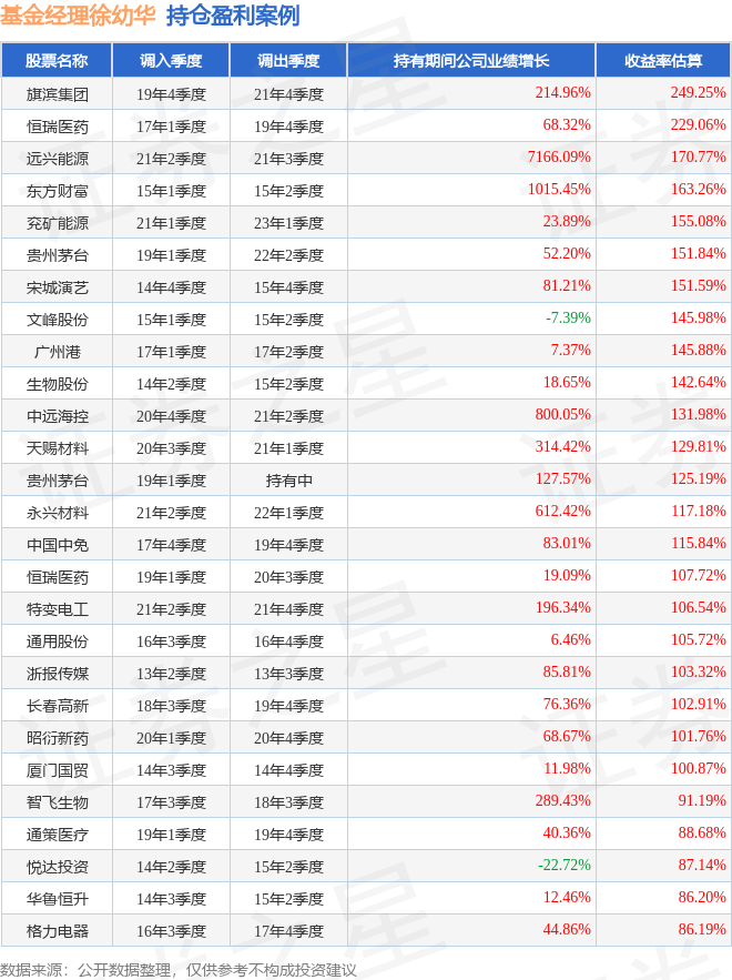 徐幼华管理的富国中证红利指数增强A基金在19年4季度买入旗滨集团,在持有2年又0个季度后在21年4季度卖出。持有期间的估算收益率为249.25%,持有期间旗滨集团在2019年到2021年的年报归属净利润增幅达214.96%。