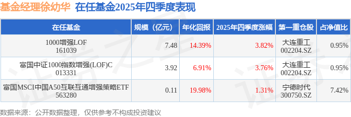 证券之星消息,截止2025年四季度末,基金经理徐幼华旗下共管理3只基金,本季度表现最佳的为1000增强LOF(161039),季度净值涨3.82%。