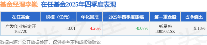 证券之星消息,截止2025年四季度末,基金经理李巍管理的广发创业板定开(162720)季度净值跌0.07%。