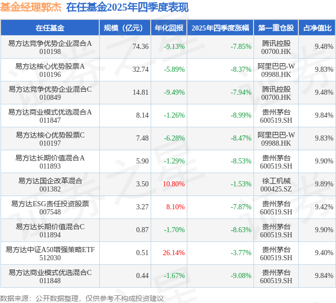 证券之星消息,截止2025年四季度末,基金经理郭杰旗下共管理11只基金,本季度表现最佳的为易方达国企改革混合(001382),季度净值跌1.53%。