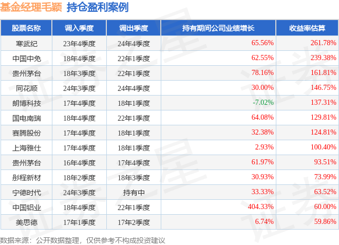 毛颖管理的华夏新锦绣混合A基金在16年4季度买入贵州茅台,在持有1年又0个季度后在17年4季度卖出。持有期间的估算收益率为93.51%,持有期间贵州茅台在2016年到2017年的年报归属净利润增幅达61.97%。