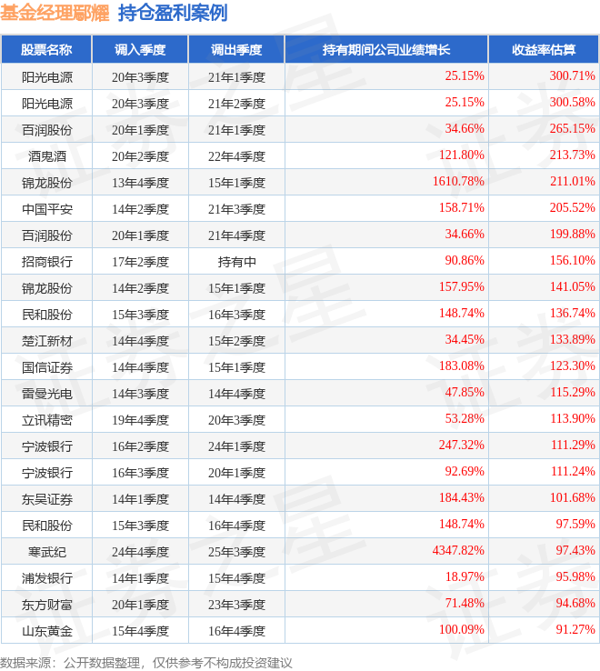 鄢耀管理的工银总回报灵活配置混合A基金在20年3季度买入阳光电源,在持有2个季度后在21年1季度卖出。持有期间的估算收益率为300.71%,持有期间阳光电源在2020年到2021年的年报营业总收入增幅达25.15%。