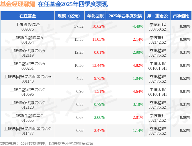 证券之星消息,截止2025年四季度末,基金经理鄢耀旗下共管理9只基金,本季度表现最佳的为工银金融地产混合A(000251),季度净值涨4.82%。
