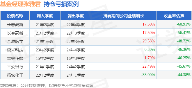 张雅君管理的易方达裕丰回报债券A基金在21年2季度买入长春高新,在持有1年又2个季度后在22年4季度卖出。持有期间的估算收益率为-60.91%,持有期间长春高新在2021年到2022年的年报营业总收入增幅达17.5%。