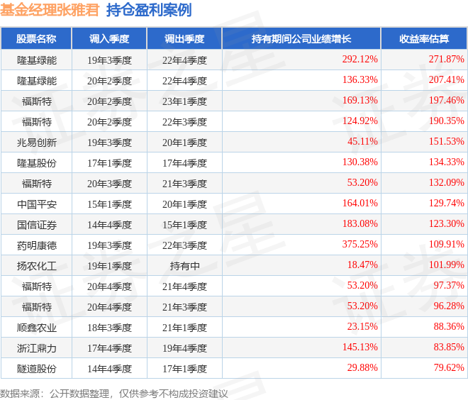 张雅君管理的易方达裕丰回报债券A基金在19年3季度买入隆基绿能,在持有3年又1个季度后在22年4季度卖出。持有期间的估算收益率为271.87%,持有期间隆基绿能在2019年到2022年的年报营业总收入增幅达292.12%。