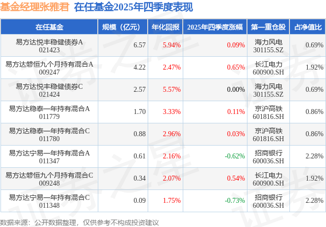 证券之星消息,截止2025年四季度末,基金经理张雅君旗下共管理8只基金,本季度表现最佳的为易方达磐恒九个月持有混合A(009247),季度净值涨0.65%。