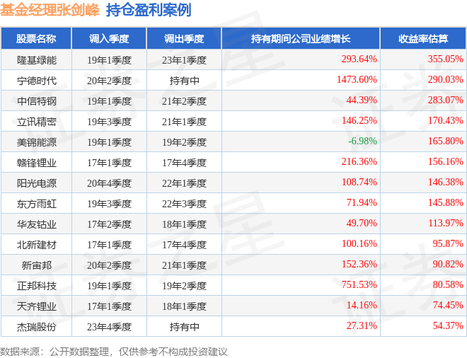 张剑峰管理的工银新材料新能源股票基金在19年1季度买入隆基绿能,在持有4年又0个季度后在23年1季度卖出。持有期间的估算收益率为355.05%,持有期间隆基绿能在2019年到2023年的年报营业总收入增幅达293.64%。