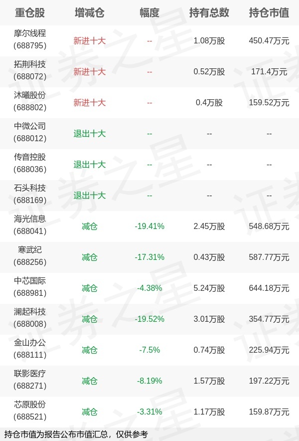 证券之星消息,1月22日易方达基金旗下林伟斌 成曦管理的易方达上证科创板50成份交易型开放式指数基金联接基金公布年报,近1年净值增长率54.22%。与上一季度相比,该基金前十大重仓股新增摩尔线程,拓荆科技,沐曦股份;其中海光信息持仓占比0.03%,为该基金第一大重仓股;中微公司,传音控股,石头科技等退出前十大重仓股;详细数据如下:
