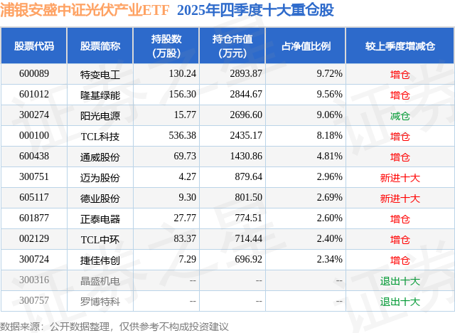 浦银安盛中证光伏产业ETF基金成立于2022年6月16日,基金经理为高钢杰,基金跟踪标的为中证光伏产业指数,成立以来超额回报为-6.56%,近一个月超额回报为0.08%。最新披露的基金持仓数据显示,截止2025年12月31日,该基金第一大重仓股为特变电工(600089),持股占比为9.72%。