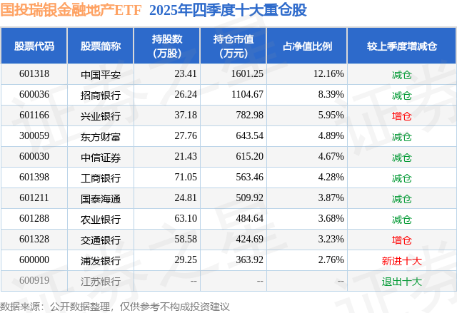 国投瑞银金融地产ETF基金成立于2013年9月17日,基金经理为赵建 钱瀚,基金跟踪标的为沪深300金融地产指数,成立以来超额回报为134.53%,近一个月超额回报为0.53%。最新披露的基金持仓数据显示,截止2025年12月31日,该基金第一大重仓股为中国平安(601318),持股占比为12.16%。