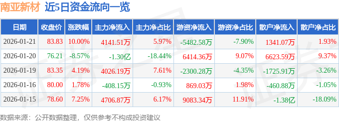 证券之星消息,截至2026年1月21日收盘,南亚新材(688519)报收于83.83元,上涨10.0%,换手率3.65%,成交量8.57万手,成交额6.94亿元。