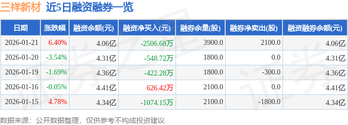 证券之星消息,截至2026年1月21日收盘,三祥新材(603663)报收于38.23元,上涨6.4%,换手率3.37%,成交量14.26万手,成交额5.37亿元。