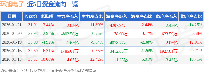 证券之星消息,截至2026年1月21日收盘,环旭电子(601231)报收于31.01元,上涨3.44%,换手率2.49%,成交量56.65万手,成交额17.22亿元。
