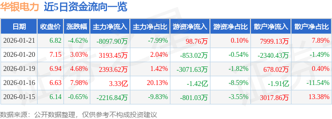 证券之星消息,截至2026年1月21日收盘,华银电力(600744)报收于6.82元,下跌4.62%,换手率7.27%,成交量147.59万手,成交额10.14亿元。