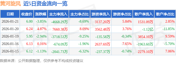证券之星消息,截至2026年1月21日收盘,黄河旋风(600172)报收于6.0元,下跌3.85%,换手率7.0%,成交量89.28万手,成交额5.37亿元。
