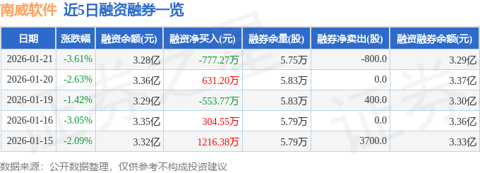 证券之星消息,截至2026年1月21日收盘,南威软件(603636)报收于11.76元,下跌3.61%,换手率5.5%,成交量31.95万手,成交额3.78亿元。