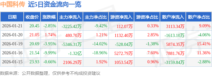 证券之星消息,截至2026年1月21日收盘,中国科传(601858)报收于20.45元,下跌2.85%,换手率2.1%,成交量16.58万手,成交额3.43亿元。
