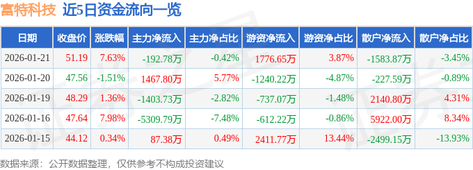 证券之星消息,截至2026年1月21日收盘,富特科技(301607)报收于51.19元,上涨7.63%,换手率8.11%,成交量9.07万手,成交额4.59亿元。