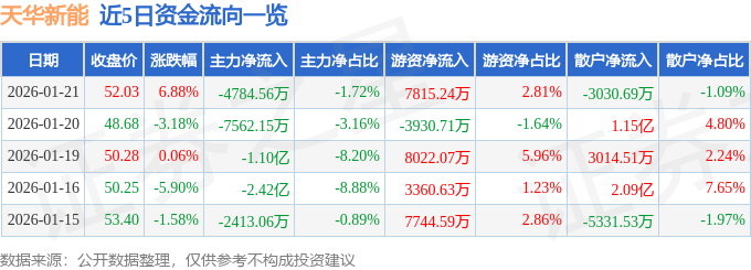 证券之星消息,截至2026年1月21日收盘,天华新能(300390)报收于52.03元,上涨6.88%,换手率8.02%,成交量53.91万手,成交额27.81亿元。