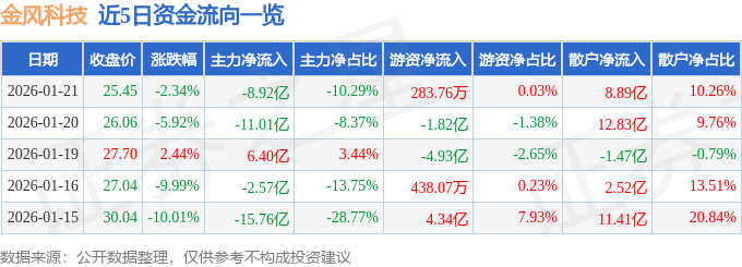 证券之星消息,截至2026年1月21日收盘,金风科技(002202)报收于25.45元,下跌2.34%,换手率9.92%,成交量333.69万手,成交额86.67亿元。