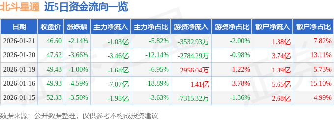 证券之星消息,截至2026年1月21日收盘,北斗星通(002151)报收于46.6元,下跌2.14%,换手率8.42%,成交量37.29万手,成交额17.63亿元。