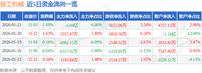 证券之星消息,截至2026年1月21日收盘,徐工机械(000425)报收于11.03元,下跌1.69%,换手率1.58%,成交量146.66万手,成交额16.05亿元。