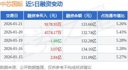 证券之星消息,1月21日,中芯国际(688981)融资买入18.91亿元,融资偿还17.99亿元,融资净买入9178.93万元,融资余额133.66亿元,近20个交易日中有11个交易日出现融资净买入。