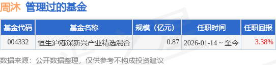 周沐先生:中国国籍,金融学硕士。曾任恒生前海基金管理有限公司股票投资部基金经理助理,恒生前海基金管理有限公司专户业务部副主管,恒生前海基金管理有限公司同业业务部经理,华西证券股份有限公司研究所行业研究员,天风证券股份有限公司研究所行业研究员。2026年01月14日担任恒生前海沪港深新兴产业精选混合型证券投资基金基金经理。