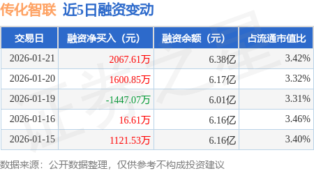 证券之星消息,1月21日,传化智联(002010)融资买入5963.4万元,融资偿还3895.8万元,融资净买入2067.61万元,融资余额6.38亿元,近20个交易日中有11个交易日出现融资净买入。