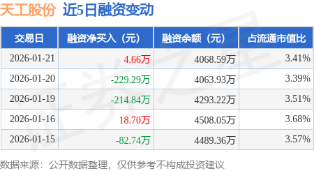 证券之星消息,1月21日,天工股份(920068)融资买入160.84万元,融资偿还156.18万元,融资净买入4.66万元,融资余额4068.59万元,近20个交易日中有11个交易日出现融资净买入。
