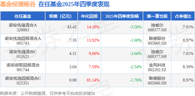 证券之星消息,截止2025年四季度末,基金经理杨谷旗下共管理5只基金,本季度表现最佳的为诺安优选回报混合A(001743),季度净值跌1.6%。