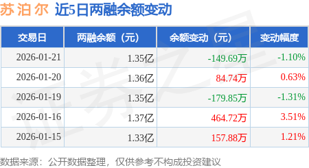 证券之星消息,1月21日,苏 泊 尔(002032)融资买入509.66万元,融资偿还659.32万元,融资净卖出149.66万元,融资余额1.33亿元,近20个交易日中有14个交易日出现融资净买入。