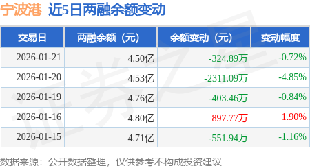 证券之星消息,1月21日,宁波港(601018)融资买入2394.41万元,融资偿还2699.0万元,融资净卖出304.59万元,融资余额4.49亿元,近20个交易日中有13个交易日出现融资净买入。