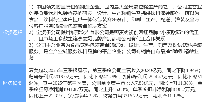 证券之星消息,嘉美包装1月22日涨停收盘,收盘价21.35元。该股于9点39分涨停,8次打开涨停,截止收盘封单资金为2564.86万元,占其流通市值0.12%。
