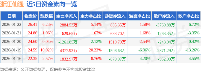 证券之星消息,截至2026年1月22日收盘,浙江仙通(603239)报收于26.41元,上涨6.23%,换手率8.09%,成交量21.9万手,成交额5.61亿元。