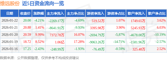 证券之星消息,截至2026年1月22日收盘,维远股份(600955)报收于20.0元,下跌4.21%,换手率4.39%,成交量24.13万手,成交额4.84亿元。