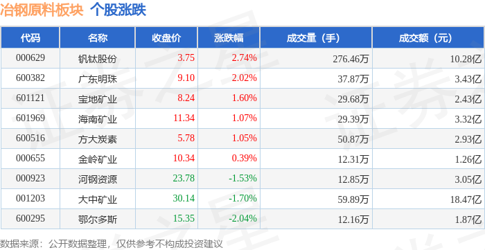 证券之星消息,1月22日冶钢原料板块较上一交易日上涨0.03%,钒钛股份领涨。当日上证指数报收于4122.58,上涨0.14%。深证成指报收于14327.05,上涨0.5%。冶钢原料板块个股涨跌见下表: