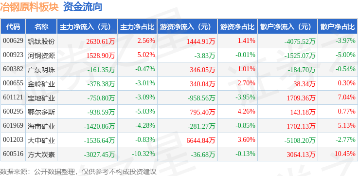 从资金流向上来看,当日冶钢原料板块主力资金净流出4054.56万元,游资资金净流入8290.9万元,散户资金净流出4236.35万元。冶钢原料板块个股资金流向见下表:
