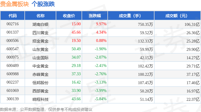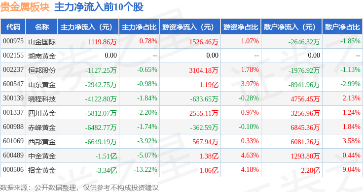 从资金流向上来看,当日贵金属板块主力资金净流出15.68亿元,游资资金净流入7.98亿元,散户资金净流入7.71亿元。贵金属板块个股资金流向见下表: