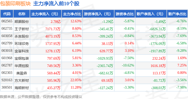 从资金流向上来看,当日包装印刷板块主力资金净流入1.01亿元,游资资金净流出1.03亿元,散户资金净流入146.48万元。包装印刷板块个股资金流向见下表: