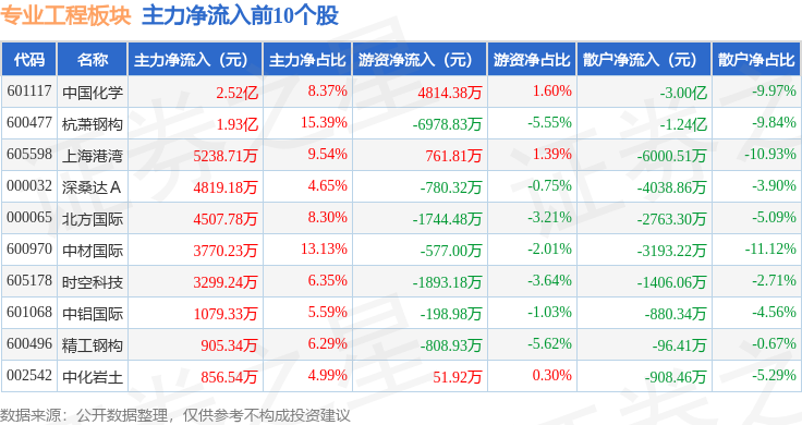 从资金流向上来看,当日专业工程板块主力资金净流入5849.08万元,游资资金净流出1.35亿元,散户资金净流入7668.29万元。专业工程板块个股资金流向见下表: