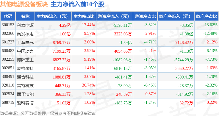 从资金流向上来看,当日其他电源设备板块主力资金净流入3.62亿元,游资资金净流出1058.88万元,散户资金净流出3.51亿元。其他电源设备板块个股资金流向见下表:
