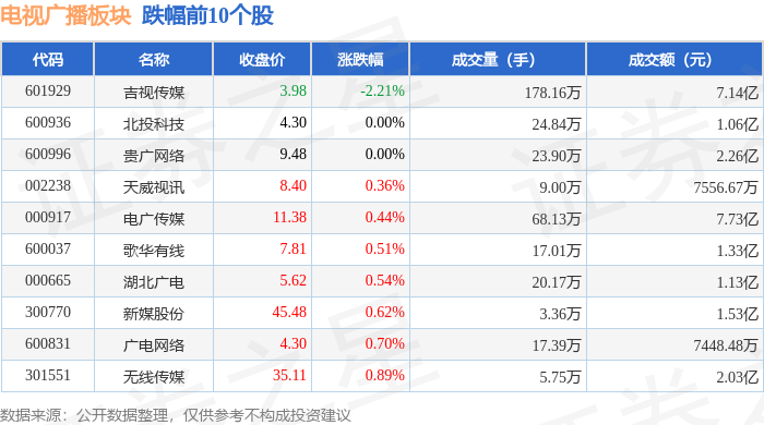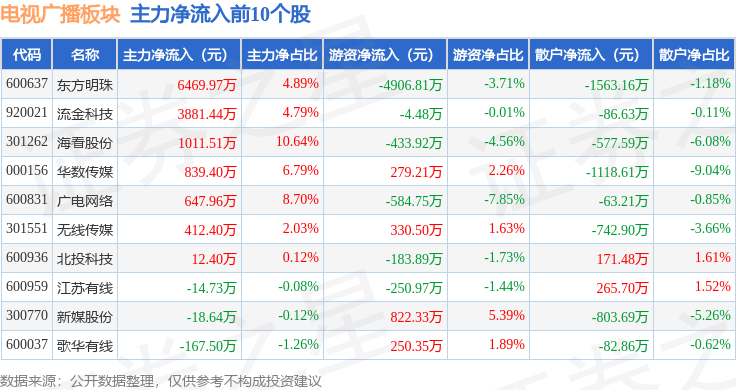 从资金流向上来看,当日电视广播板块主力资金净流出5007.31万元,游资资金净流出1082.8万元,散户资金净流入6090.11万元。电视广播板块个股资金流向见下表: